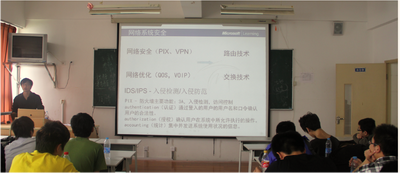 讲座中徐琦伟老师为同学们系统地讲解了目前企业网络的基本架构,以及如何从提高通信速率(QoS、VPN、EtherChannel)、保证网络稳定性(多种冗余手段:双线冗余、多设备冗余、备用电源、多出口)、提高网络系统安全(网络安全、网络优化、IDS/IPS)、提供便捷服务(地址自动获取、无线、合理IP规划、安全远程连接、网络监控)等四个方面来提高企业网络的质量。最后,徐老师为大家分析了IT行业的竞争优势和职业取向,真诚地希望大家能根据自身情况,好好学习基础课程,确立正确的发展目标,尽最大的努力为自己的未来打下坚实的基础,讲座在一片轻松和谐的氛围中结束了。